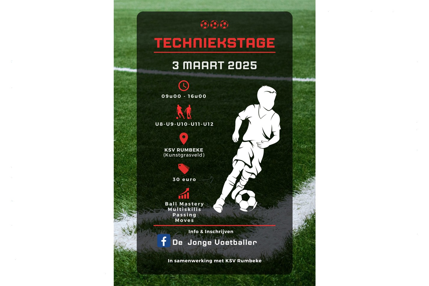 Op maandag 3 maart organiseert De Jonge Voetballer in samenwerking met KSV Rumbeke de jaarlijkse techniekstage. Ondertussen zijn we toe aan onze 4de editie. Hieronder vind je alle praktische info:
