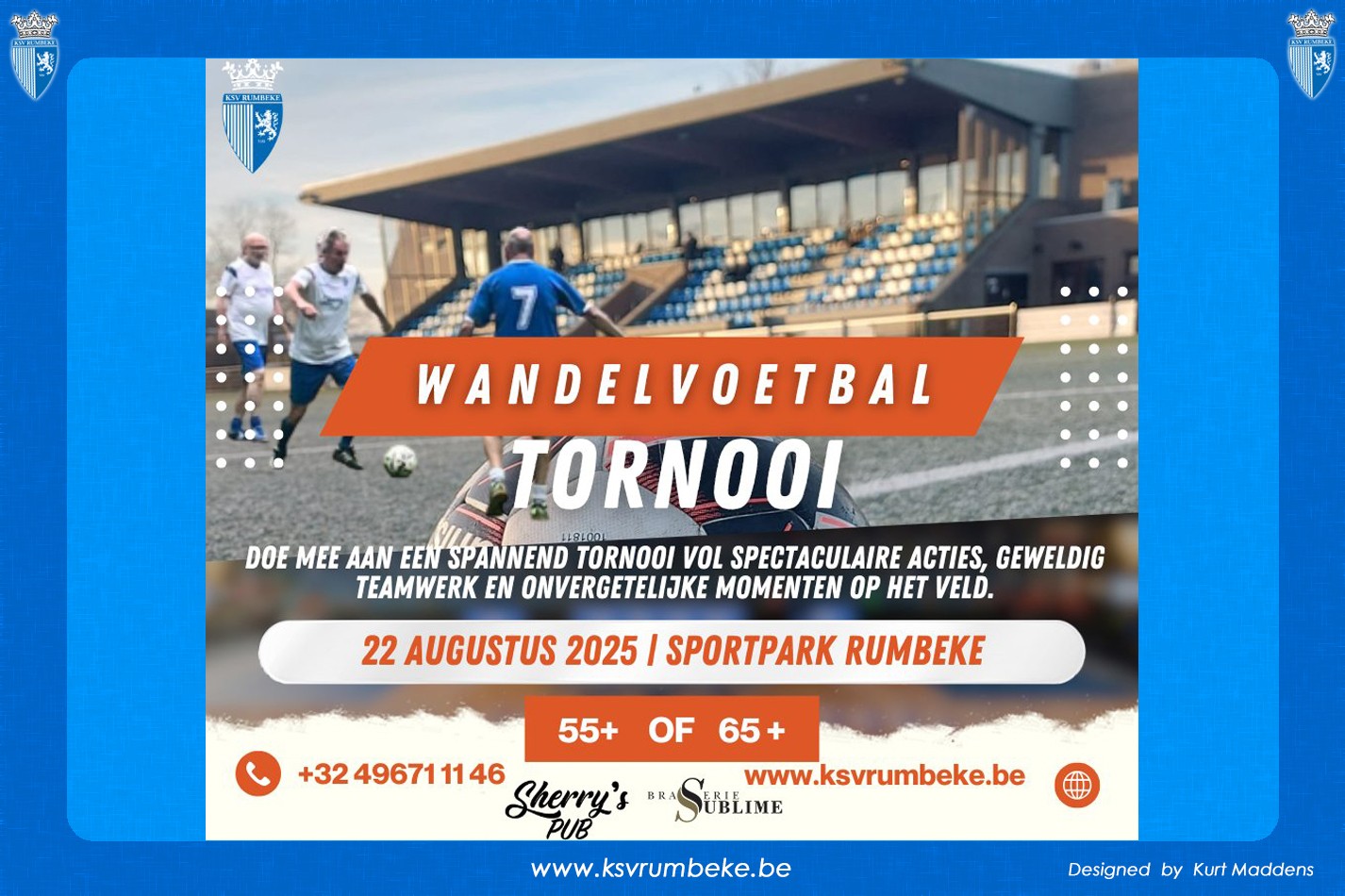 Op vrijdag 22 augustus 2025 organiseren wij voor de 4de maal een wandelvoetbaltornooi op het terrein van KSV Rumbeke (kunstgras), waartoe wij jullie vriendelijk willen uitnodigen.
