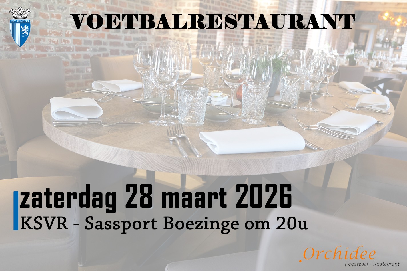 Vierde voetbalrestaurant van het seizoen 2025-2026 gaat door op zaterdag 28 maart 2026. Wedstrijd op het programma voor deze avond is KSV Rumbeke - Sassport Boezinge om 20u.