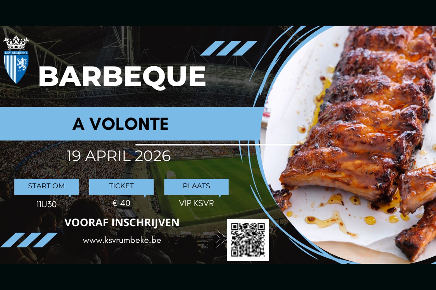 Op zondag 19 april 2026 spelen we onze laatste thuismatch van de reguliere competitie om 15 u tegen Berlare en we willen U graag uitnodigen op onze BBQ voor partners, ouders en sympathisanten van ons eerste elftal in de VIP-ruimte.