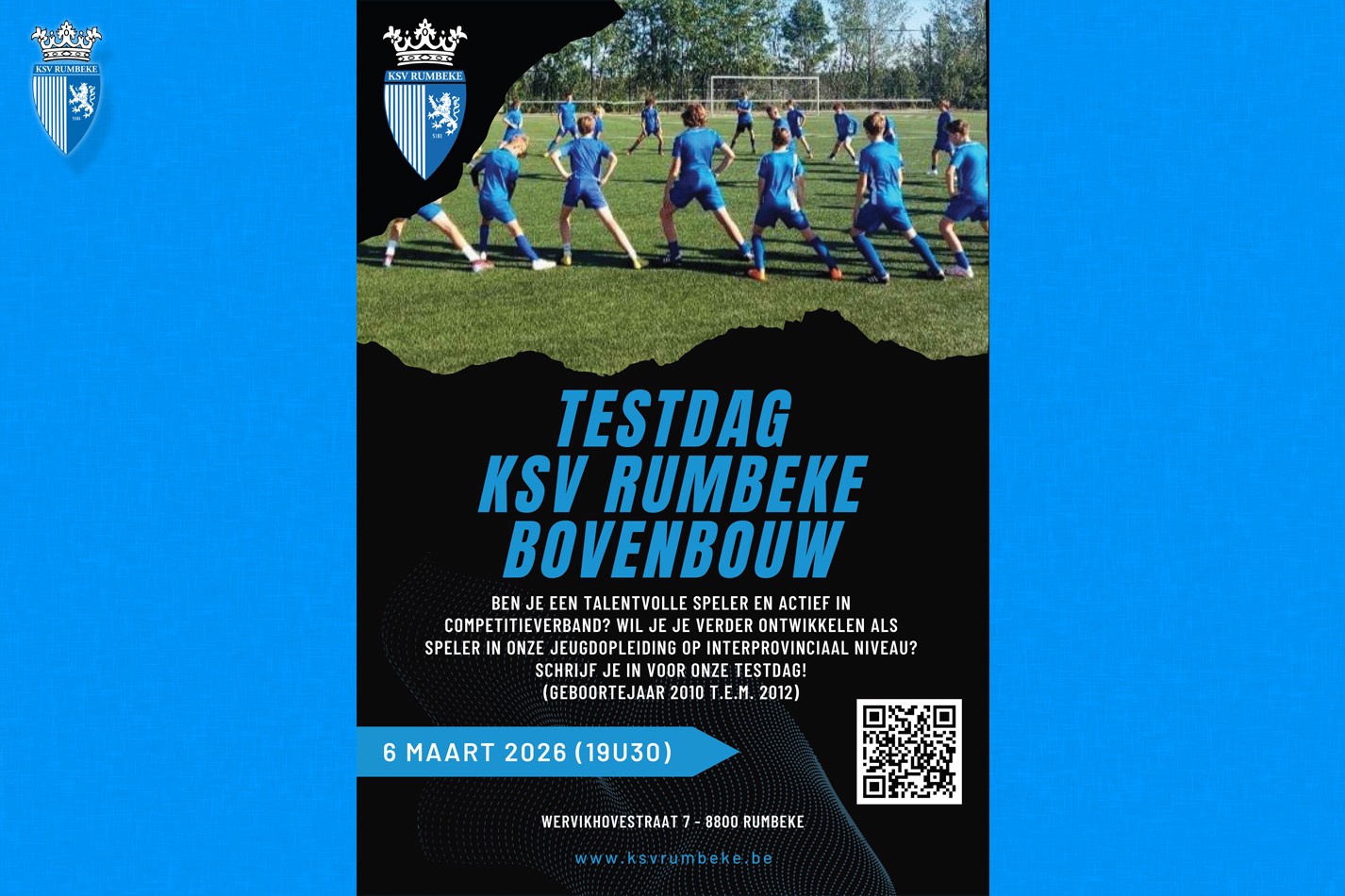 De Testdag voor bovenbouw (geboortejaren 2010 t.e.m. 2012) gaat door op vrijdag 6 maart 2026 (19u30 - 21u00).