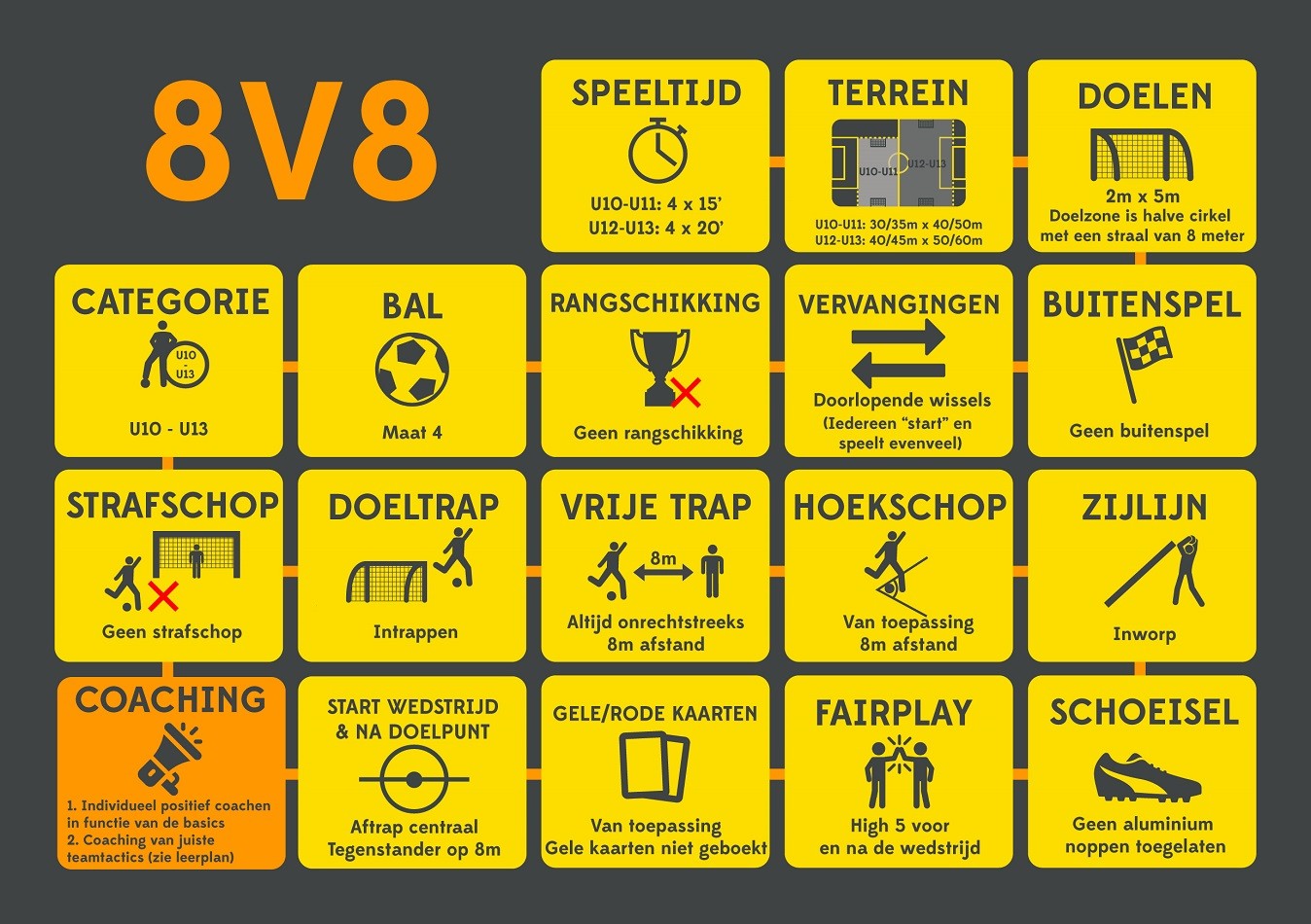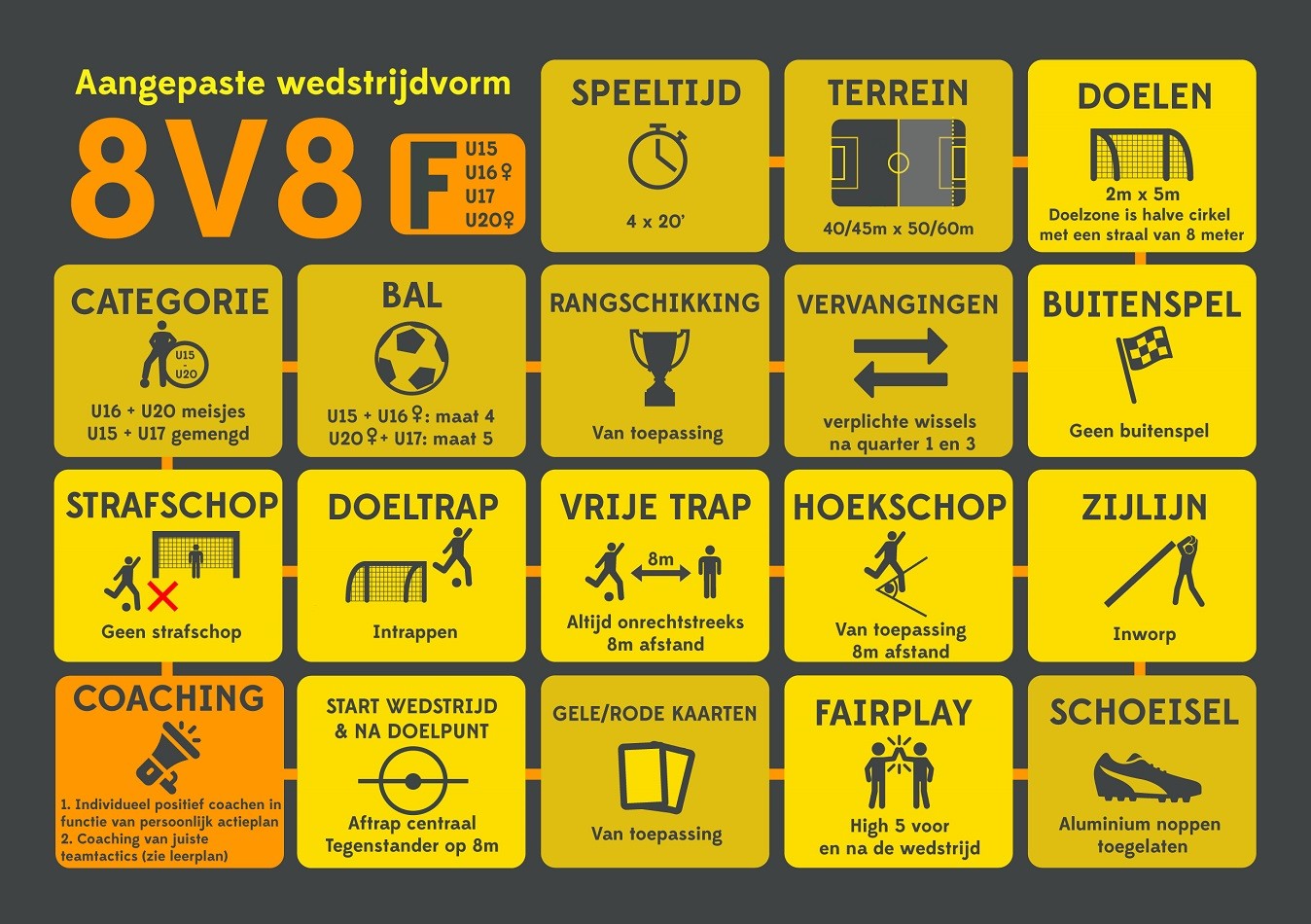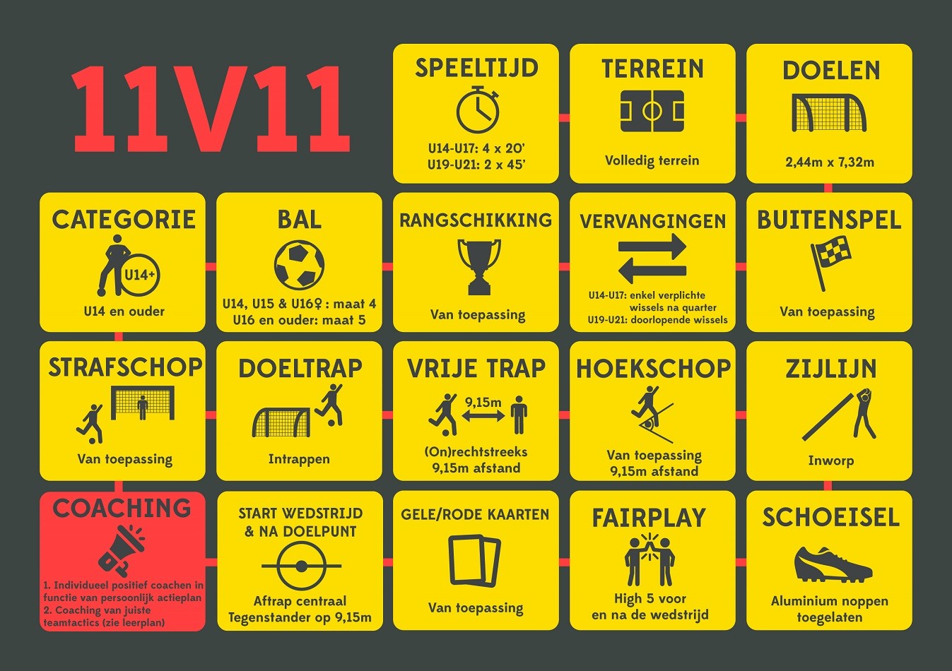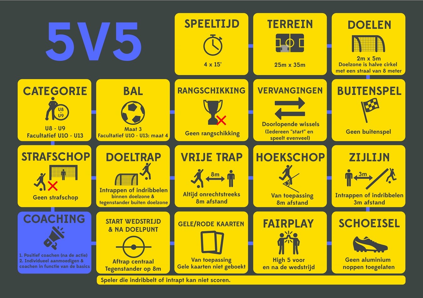 Meisjes en jongens willen zich niet alleen amuseren op het veld, ze willen ook samen spelen en bijleren. Gebruik dus de juiste spelformats in het belang van het kind! Hieronder vind je de spelregels voor 2vs2 , 3vs3, 5vs5, 8vs8 en 11vs11 terug.