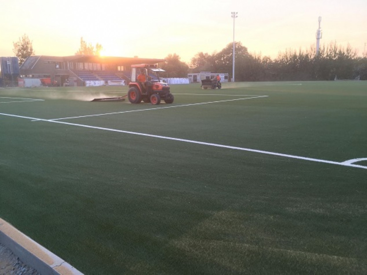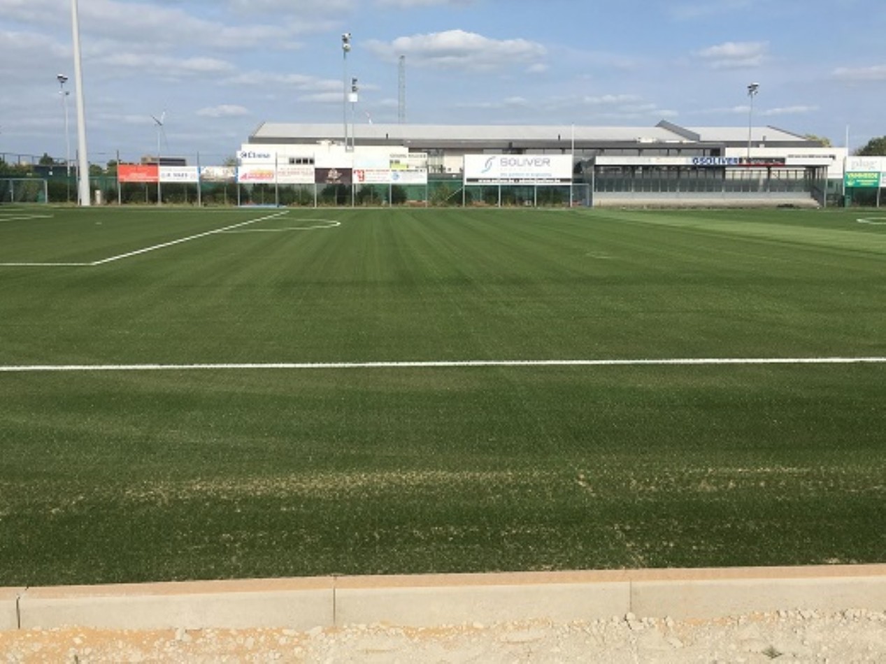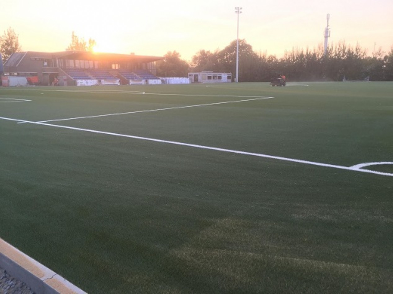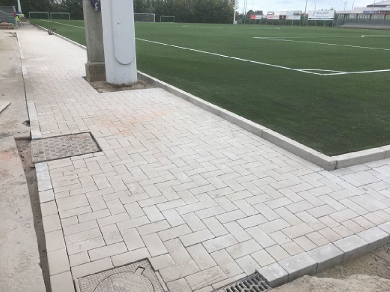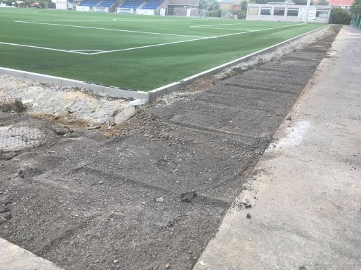 Intussen ligt de kunstgrasmat al en vandaag, vrijdag 14 september zijn begonnen met het leggen van betonklinkers rond het veld. Vanaf nu kan het vlug veranderen.