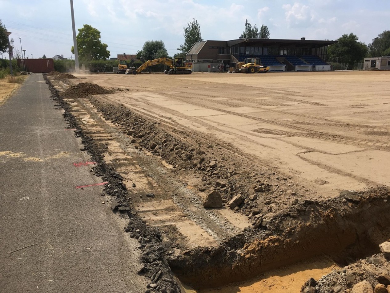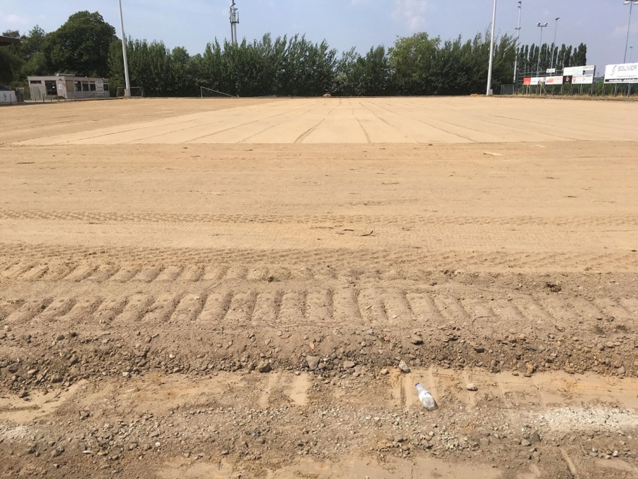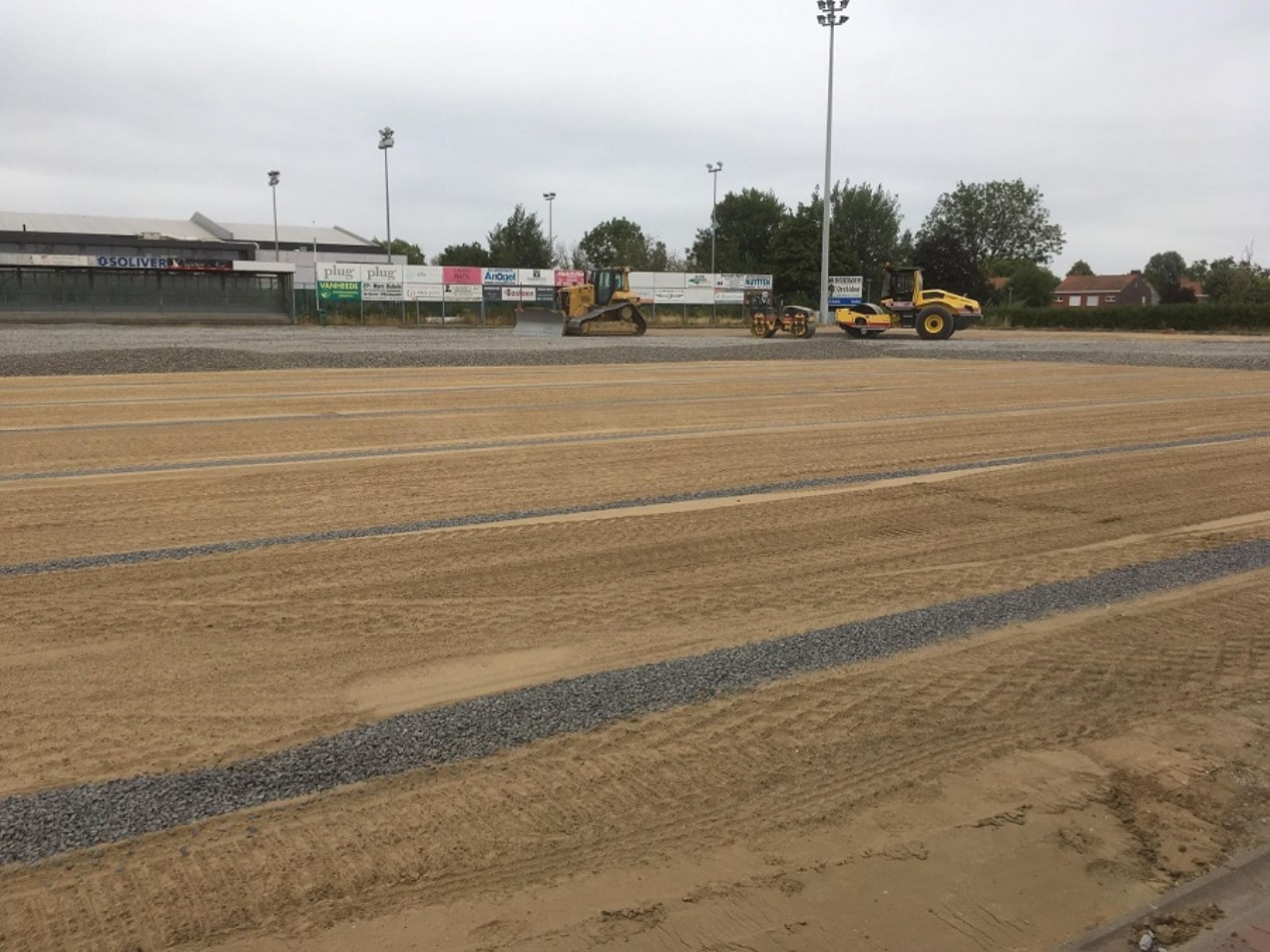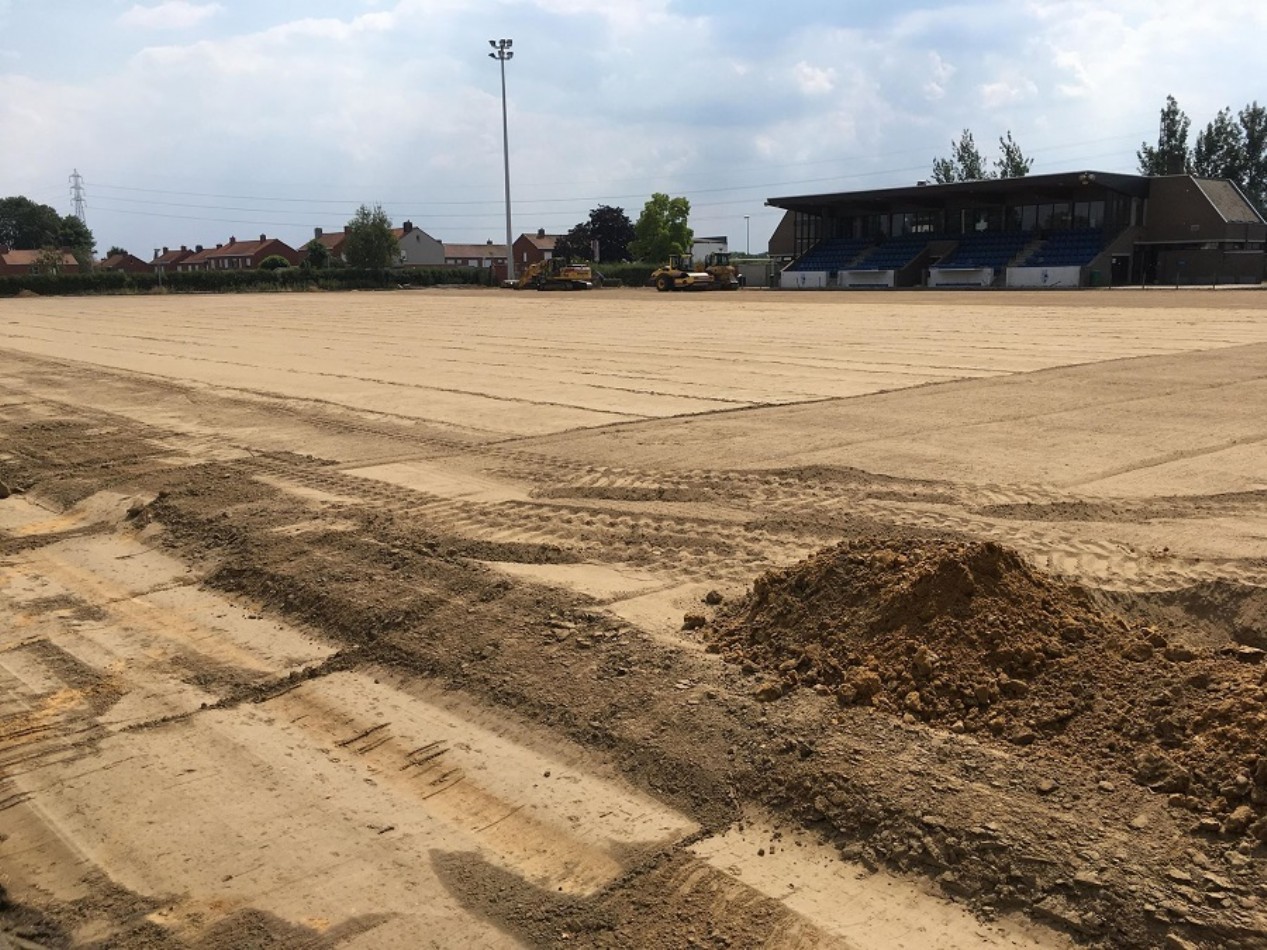De werken aan het hoofdterrein maken vorderingen om tot een mooi kunstgrasveld te bekomen.