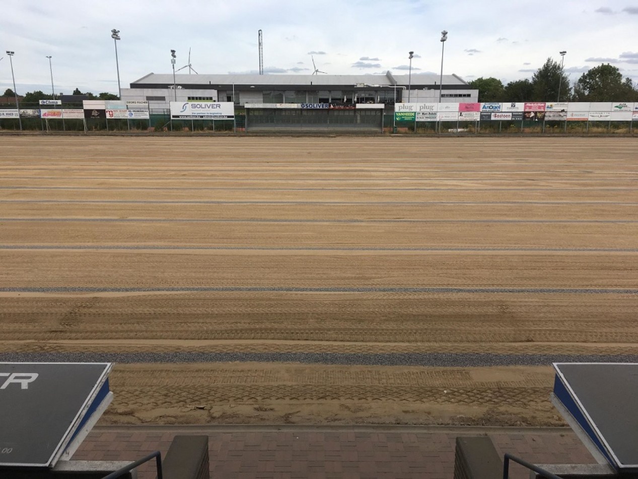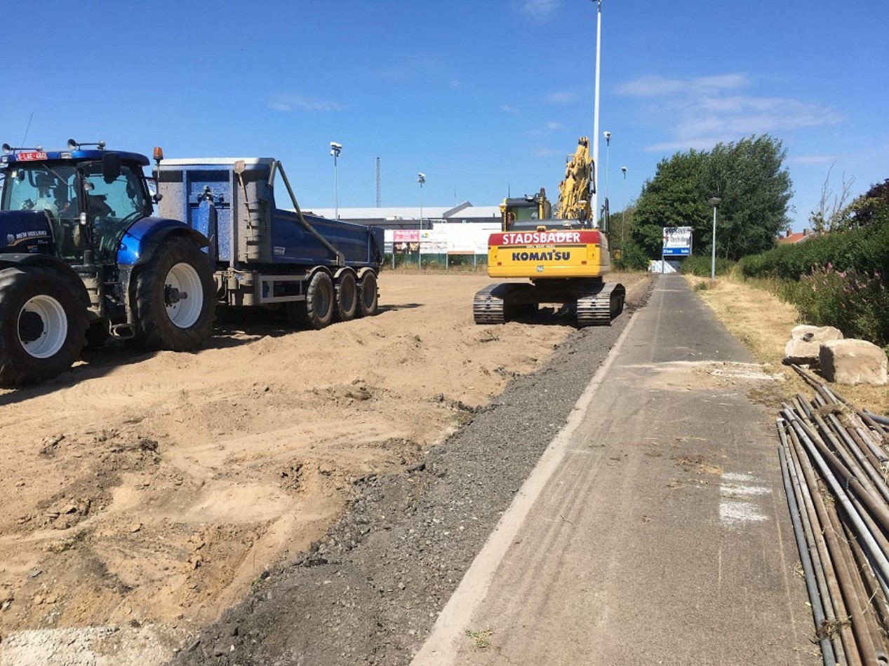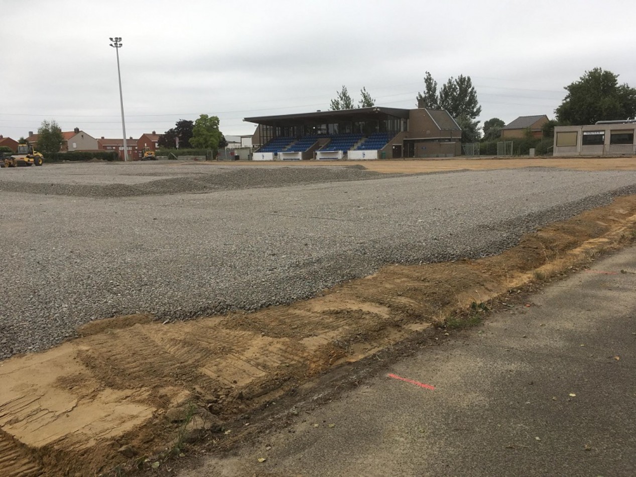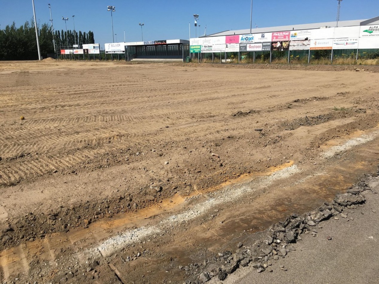 De werken aan het hoofdterrein maken vorderingen om tot een mooi kunstgrasveld te bekomen.