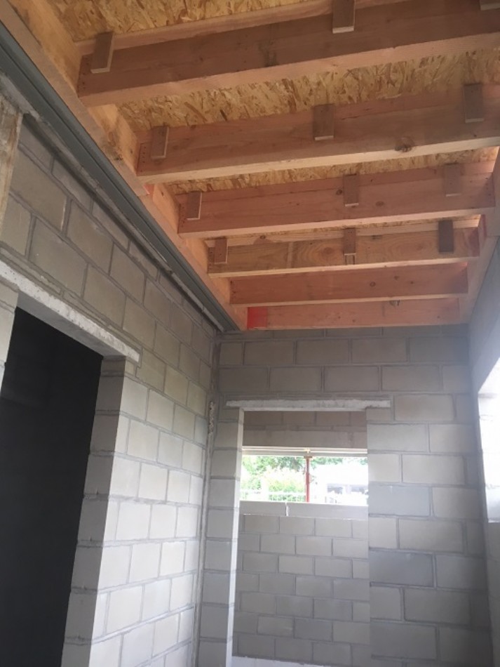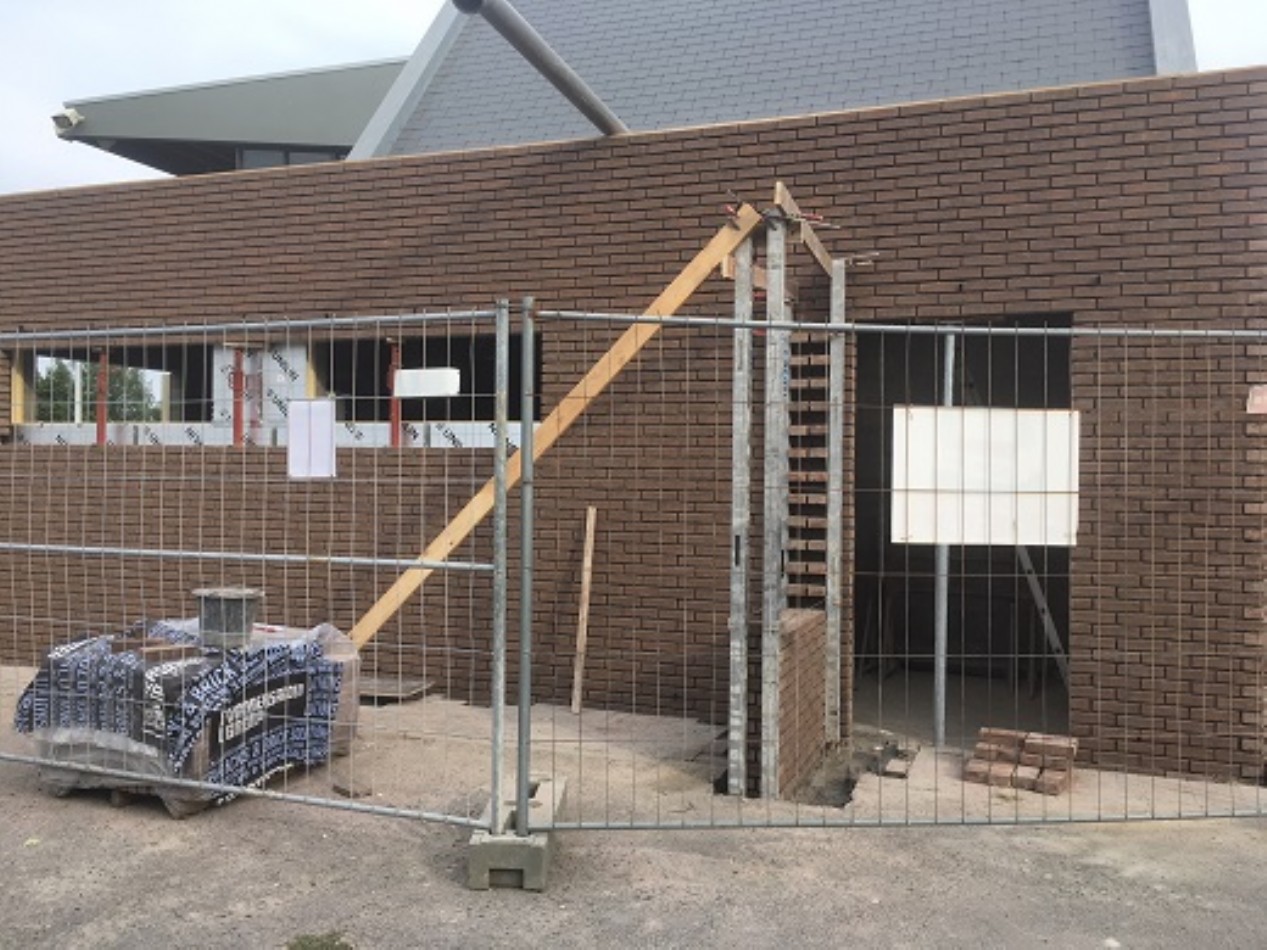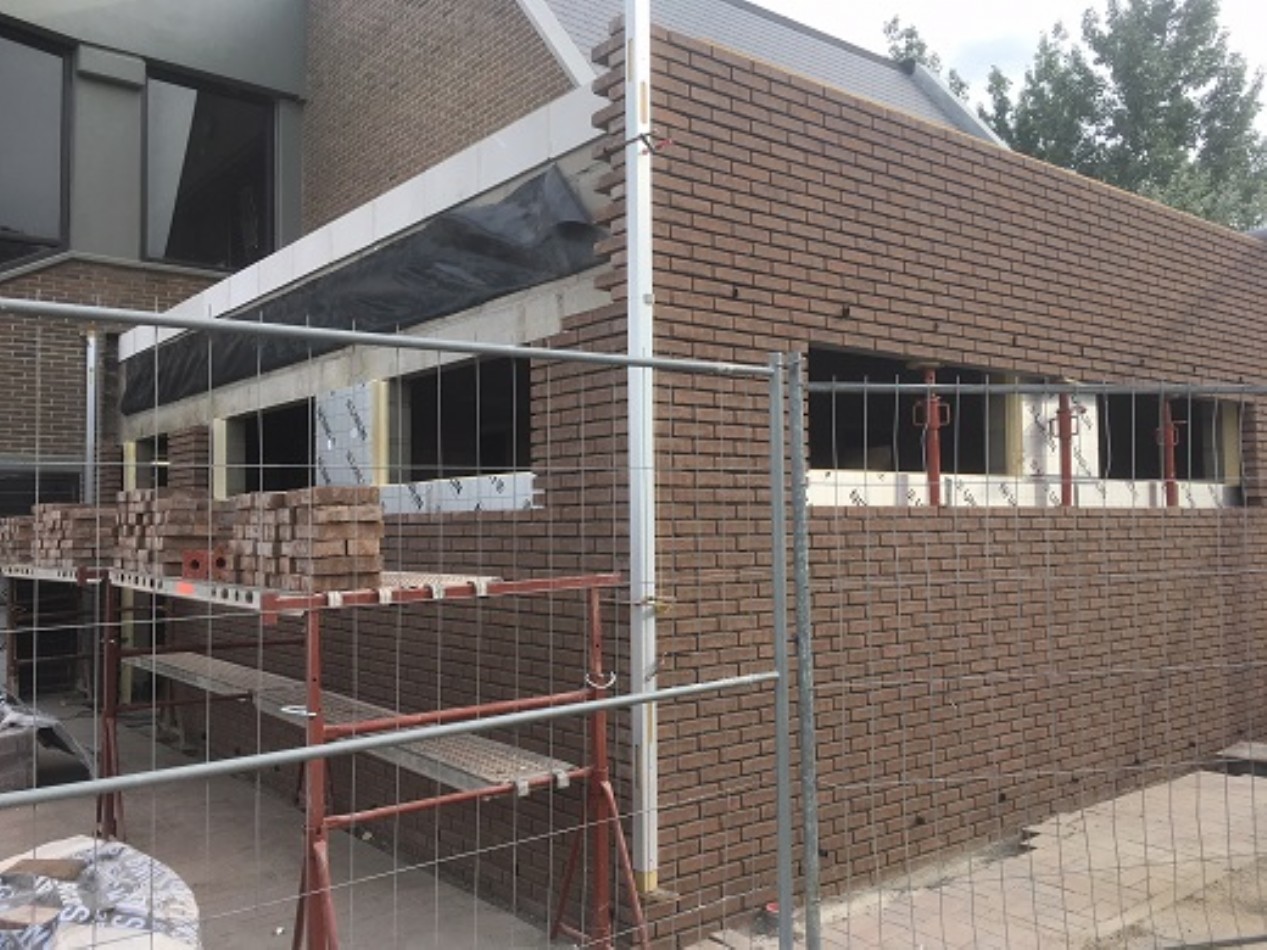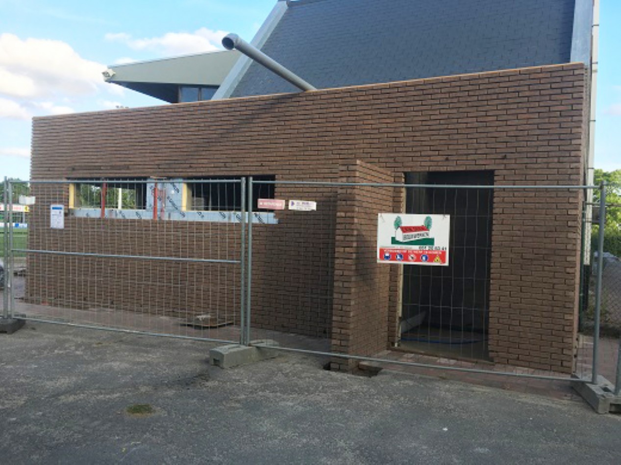 De werken aan de nieuwe kleedkamers schieten goed op. Net voor het bouwverlof zijn de metselwerken afgerond. Zowel de binnenmuren en gevelmetselwerk is afgerond.