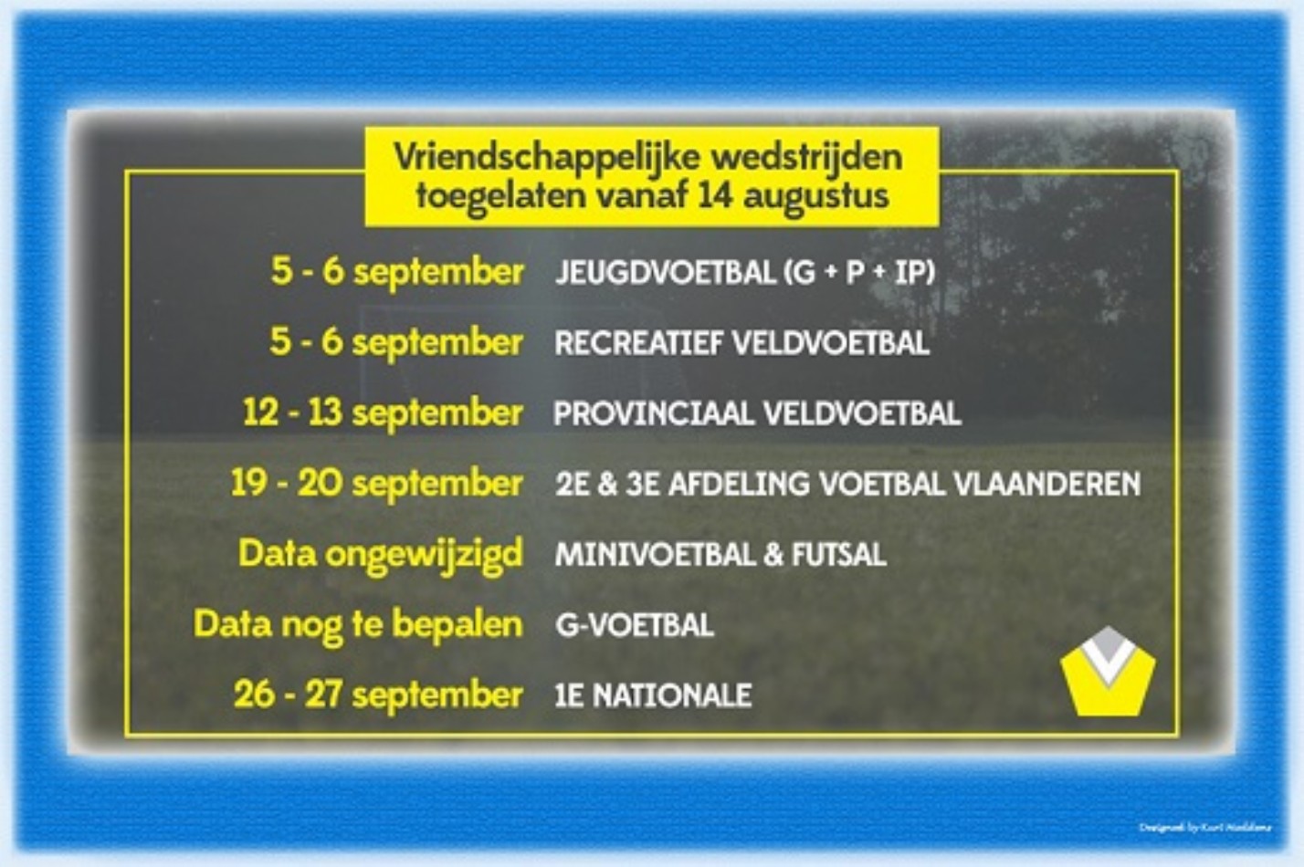 "Na veelvuldig en grondig overleg tussen de politiek en de sportsector - ook rechtstreeks tussen de minister en het kabinet Sport met de voorzitter en de Secretaris-generaal van Voetbal Vlaanderen - werd beslist om een doorstart te realiseren voor de sportactiviteiten in Vlaanderen. Het Bestuur van Voetbal Vlaanderen besliste tegelijkertijd, op basis van deze evolutie én rekening houdend met de ruime info vanuit de basis, vriendschappelijke wedstrijden opnieuw toe te laten vanaf vrijdag 14 augustus 2020 en dit voor alle Voetbal Vlaanderen clubs, zowel indoor als outdoor. Hierdoor kan de doorstart van de competitievoorbereiding worden verdergezet. Ook over de competitiestart 2020-2021 nam het Bestuur van Voetbal Vlaanderen een beslissing.