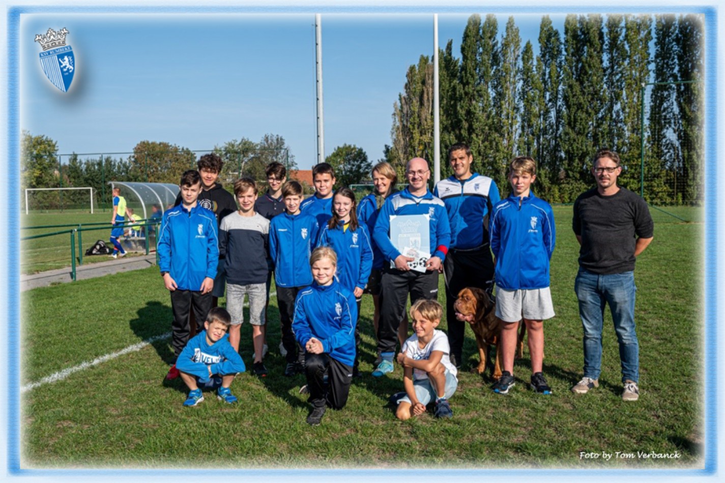 Vorige zondag was Rik aanwezig op de club als afgevaardigde van onze Gewestelijke Reserven. Het ideale moment om hem alsnog in de bloemetjes te zetten. Een tiental jeugdkeepers zakte zondagmorgen vroeg samen met collega keepertrainer Diego speciaal naar het Sportpark af om een aandenken te overhandigen aan hun trainer Rik.