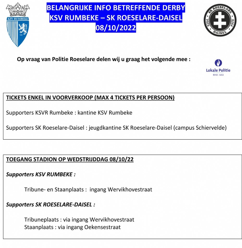 Tickets in voorverkoop voor de derby KSVR - SKRD op het Rumbeekse Sportpark (in de kantine):