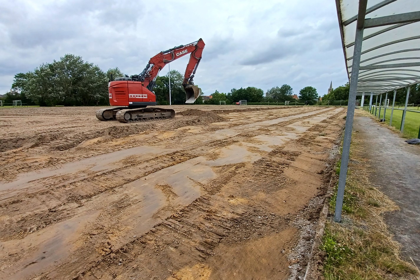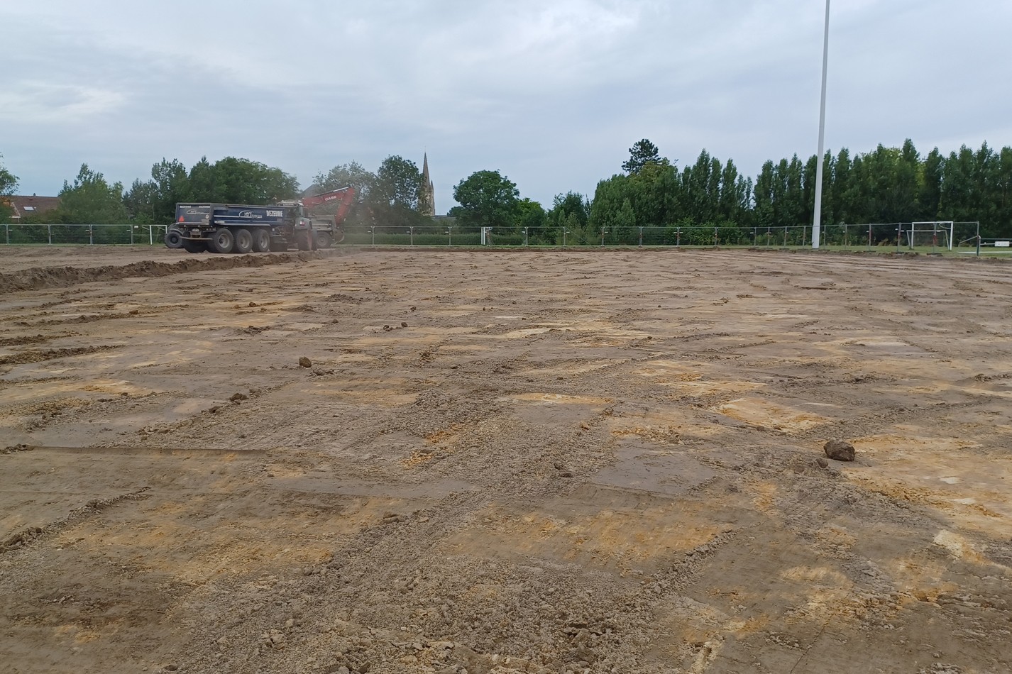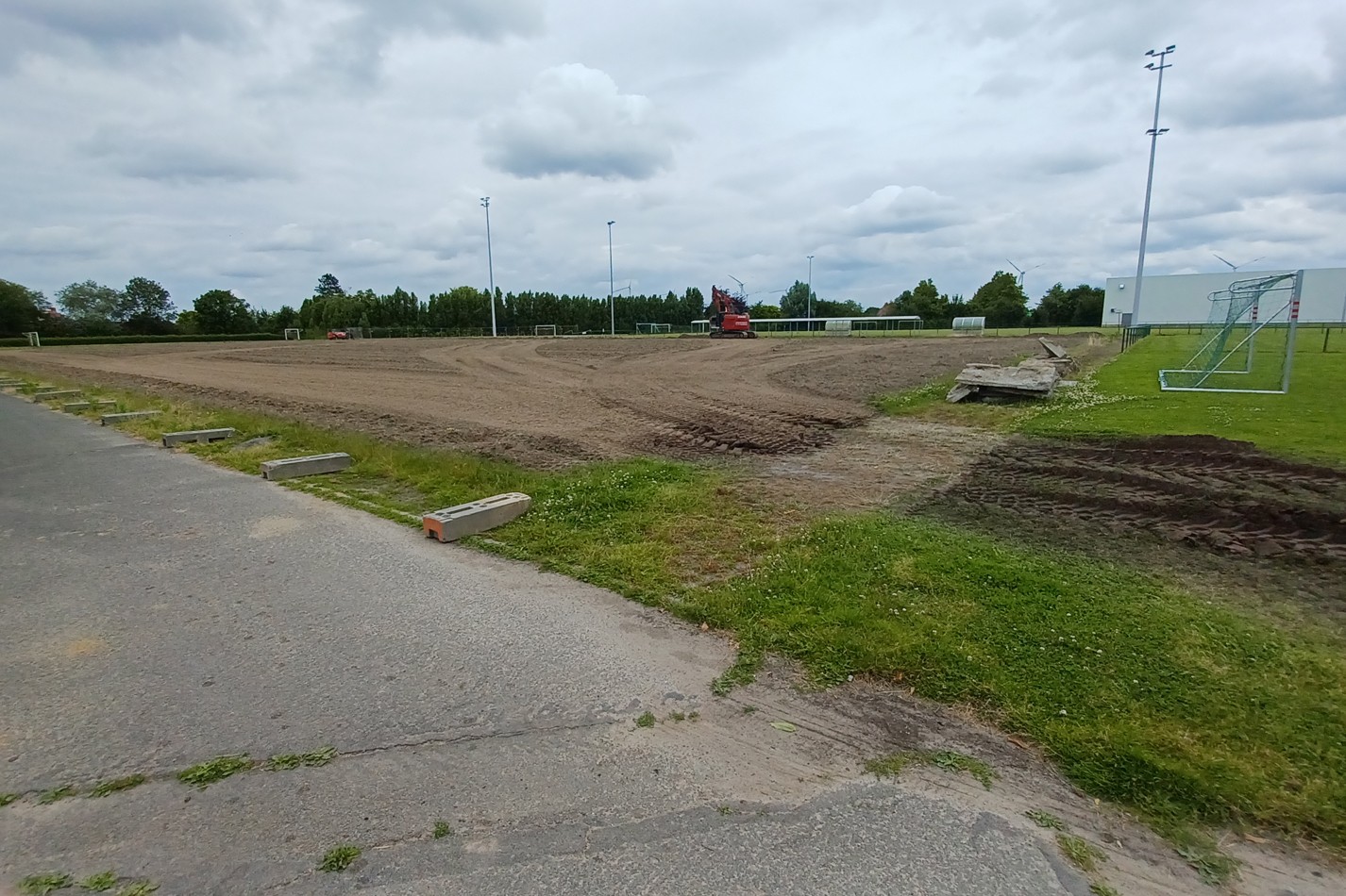 De werkzaamheden voor het tweede kunstgrasveld zijn op maandag 8 juli 2024 van start gegaan. Deze week is het afgraven en nivelleren van het terrein gepland.