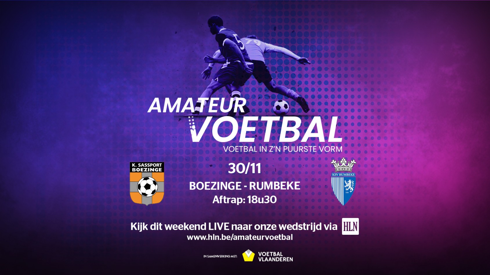 De wedstrijd aanstaande zaterdag 30 november 2024, in en tegen Sassport Boezinge, begint om 18u30. Degenen die er niet bij kunnen zijn, kunnen deze wedstrijd volgen via hln.be/amateurvoetbal .