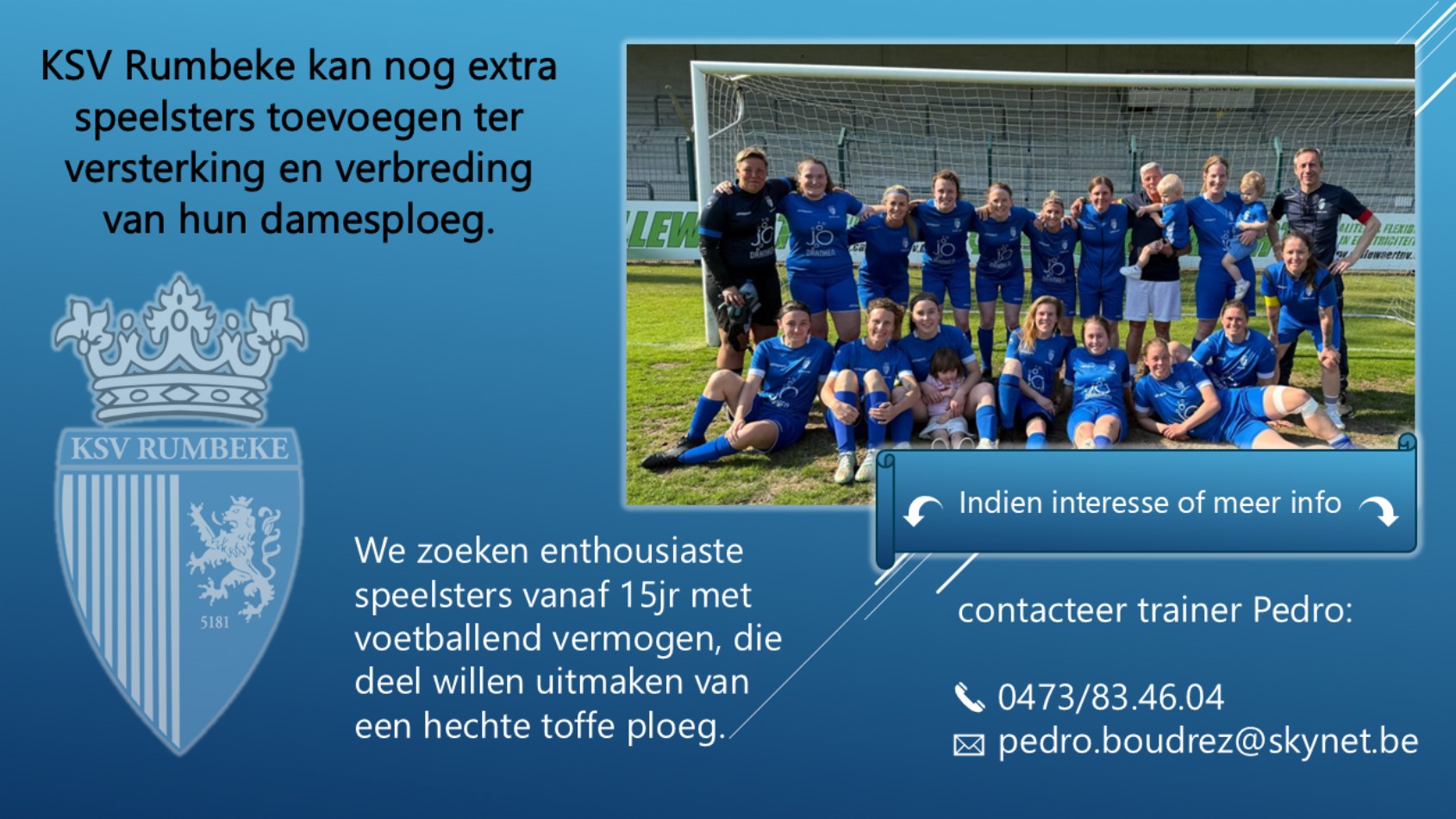 We zoeken enthousiaste speelsters vanaf 15 jaar met voetballend vermogen, die deel willen uitmaken van een hechte toffe ploeg. Dit voor versterking en verbreding van hun dameselftal.
