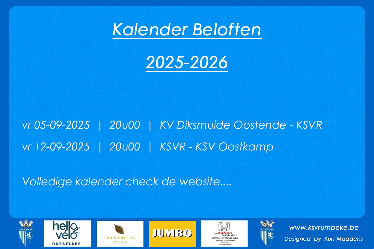 De competitie starten we op het veld van KV Diksmuide Oostende op vrijdagavond 5 september 2025 om 20u. Een week later mogen we KSV Oostkamp ontvangen op het Rumbeekse Sportpark om 20u.