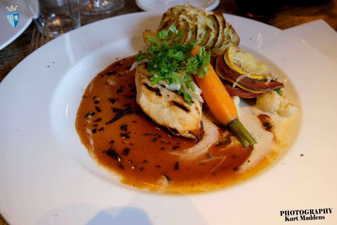 Na dit uitgebreide aperitief was het tijd om plaats te nemen in de zaal op het menu: gegrilde Mechelse koekoek met dragonsaus, een Provençaals torentje en gepofte aardappel.