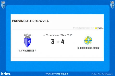 Vanaf het eerste fluitsignaal in de Rumbeekse arena weerklonk zagen we dat de bezoekers duidelijk veel zin hadden om onze mannen lastig te maken. KSVR had moeite om gelijkwaardig te zijn aan de tegenstanders. Dosko Sint-Kruis dreigde regelmatig en we konden in het eerste kwartier tweemaal de bal van de lijn wegwerken, terwijl wij onze kansen verprutsten. Na een kwartier scoorden de bezoekers en moesten we achtergen (0-1). KSVR probeerde alles uit de kast te halen om de gelijkmaker te scoren en dat lukte in minuut 21 via S. Tyvaert (1-1). De bezoekers namen geen genoegen met deze gelijkmaker. Ze konden onze mannen lastig maken, waarbij KSVR soms paniekvoetbal speelde. Alles lukte plots niet meer zoals het moest. In minuut 34 kon Dosko Sint-Kruis de 1-2 scoren en een minuut later liepen ze verder uit tot 1-3. Jammer genoeg hadden we in de minuten daarvoor enorme kansen om zelf uit te lopen, maar de afwerking werd telkens de nek omgewrongen. KSVR zocht en zocht naar het doelpunt, maar we moesten met schaamte toekijken naar een 1-3 achterstand bij de rust.